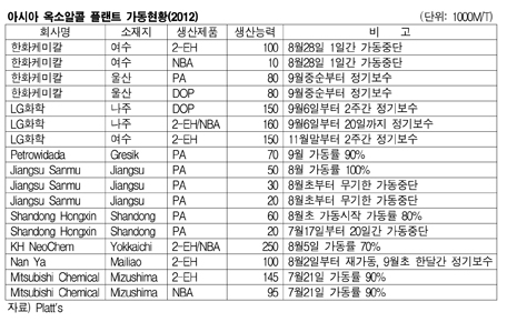 표, 그래프: < 아시아 옥소알콜 플랜트 가동현황(2012) > <화학저널 2012/09/17> |