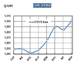 LDPE 가격은 9월12일 CFR FE Asia 톤당 1301달러로 16달러 상승했다.