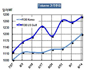 톨루엔 가격은 9월14일 FOB Korea 톤당 1201달러로 38달러 상승했다.