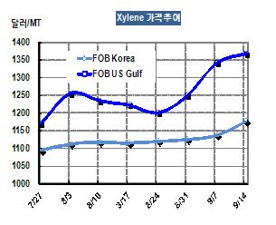 M-X 가격은 9월14일 FOB Korea 톤당 1175달러로 38달러 상승했다. Isomer 그레이드 M-X 가격이 FOB Korea 톤당 1350달러로 12달러 상승해 26주만에 가장 높은 가격대를 형성한 것도 영향을 미쳤다. 표, 그래프: < Xylene 가격추이 > <화학저널 2012/09/20> |
