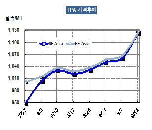 아시아 PTA(Purified Terephthalic Acid) 가격은 9월12일 CFR FE Asia 톤당 1123달러로 62달러 급등하며 5월 중순 이후 최고치를 기록했다. 또 PTA 원료인 P-X(Para-Xylene) 가격이 88달러 급등하며 FOB Korea 톤당 1601달러를 기록해 가격상승이 불가피했던 것으로 나타났다. 표, 그래프: < TPA 가격추이 > <화학저널 2012/09/20> |