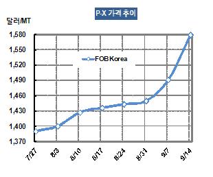 P-X 가격은 9월14일 FOB Korea 톤당 1580달러로 88달러 폭등했다. 특히, 미국 연방준비제도위원회가 월 400억달러를 풀고 금리를 동결키로 결정한 것이 큰 영향을 미쳤다. 글로벌 경제에 활력소로 작용할 수 있기 때문이다. 표, 그래프: < P-X 가격추이 > <화학저널 2012/09/20> |