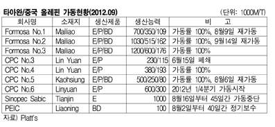 타이완 올레핀(Olefin) 시장의 공급과잉이 지속되고 있다. 반면, 중국 올레핀 시장은 Sinopec Sabic 및 PEIC가 8-9월 정기보수를 실시해 수급타이트가 지속되고 있다. 표, 그래프: < 타아완/중국 올레핀 가동현황(2012.09) > <화학저널 2012/09/20> |