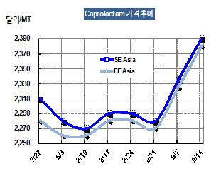 아시아 CPL(Caprolactam) 시세는 중국 국경절 연휴 이전 수요 증가 기대감으로 CFR China 톤당 2380달러, 동남아시아는 CFR SE Asia 톤당 2380달러를 형성했다.