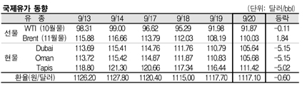 9월20일 105.64달러로 5.15달러 떨어져 … 브렌트는 110달러대 회복