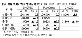 중국 석유ㆍ화학기업 SINOPEC(China Petroleum & Chemical), PetroChina, CNOOC(China National Offshore Oil)의 2012년 상반기 영업실적이 부진한 것으로 나타났다. 표, 그래프: < 중국 석유·화학기업의 영업실적(2012.H1) > <화학저널 2012/09/21> |