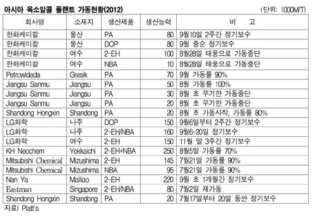 아시아 옥소알콜(Oxo-Alcohol) 시장이 9월 정기보수가 이어지면서 수급타이트가 심화될 것으로 예상된다. 한편, Jiangsu Sanmu는 Jiangsu 소재 PA 3만톤 및 2만톤 플랜트를 8월 초부터 무기한 가동 중단했고, Petrowidada는 Gresik 소재 PA 7만톤 플랜트를 8월2일 가동 중단했으나 현재는 90% 수준으로 가동하고 있는 것으로 알려졌다. <이민지 기자> 표, 그래프: < 아시아 옥소알콜 플랜트 가동현황(2012) > <화학저널 2012/09/24> |