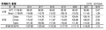 9월21일 국제유가는 스페인 전면 구제금융 신청 전망, 저가 매수세 유입 등의 영향으로 상승했다.