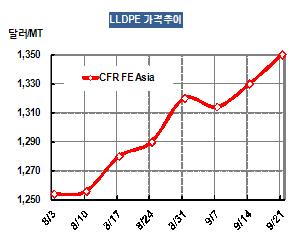 LLDPE 가격은 9월19일 CFR FE Asia 톤당 1350달러로 20달러 상승했다. 중국 Dalian 상업거래소에서도 미국의 3차 양적완화 정책이 발표된 후 톤당 1만890위안으로 460위안 상승했다. 상승 제한폭인 4%까지 오른 것으로 나타났다. 표, 그래프: < LLDPE 가격추이 > <화학저널 2012/09/24> |