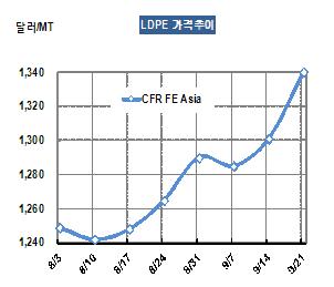 LDPE 가격은 9월19일 CFR FE Asia 톤당 1340달러로 39달러 폭등했다. Sinopec이 내수 공급가격을 ex-works 톤당 1만1500위안으로 600위안 인상한 것도 영향을 미쳤다. 표, 그래프: < LDPE 가격추이 > <화학저널 2012/09/24> |