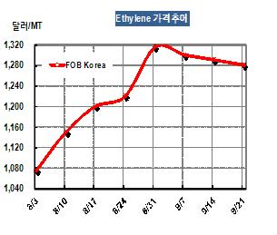에틸렌 가격은 9월21일 FOB Korea 톤당 1280달러로 10달러 하락했다. 아시아 에틸렌 시장은 PE(Polyethylene)을 비롯한 다운스트림이 수익성 악화로 가동률을 낮춤에 따라 수요가 줄어들고 있다. 표, 그래프: < Ethylene 가격추이 > <화학저널 2012/09/24> |