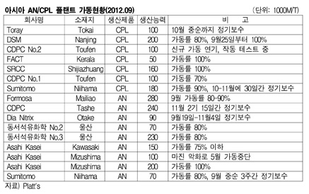 아시아 CPL(Caprolactam) 시장이 높은 가동률을 나타내 수급밸런스를 유지할 것으로 예상된다. 한편, 아시아 AN(Acrylonitrile) 시장은 수급타이트를 해소하기 힘들 것으로 예상된다. 표, 그래프: < 아시아 AN/CPL 플랜트 가동현황(2012.09) > <화학저널 2012/09/25> |