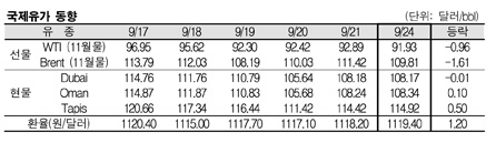 9월24일 브렌트유 109.17달러로 1.61달러 급락 … 두바이유 약보합