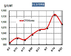 MEG 가격은 9월21일 CFR China 톤당 1090달러로 50달러 급락했다. MEG는 중국의 수요기업들이 10월 국경절 연휴에 앞서 배고 보충에 나서면서 9월17일에는 CFR China 톤당 1151달러까지 폭등해 2011년 10월20일 이후 가장 높은 가격을 형성했었다. 표, 그래프: < EG 가격추이 > <화학저널 2012/09/25> |