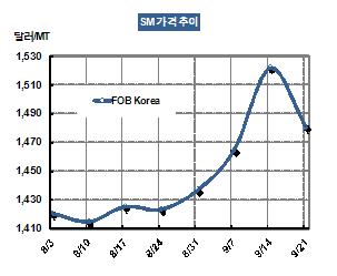 SM 가격은 9월21일 FOB Korea 톤당 1480달러로 42달러 급락했다. 여기에 원료 벤젠(Benzene) 가격이 FOB Korea 톤당 1219달러로 30달러 하락한 것도 영향을 미쳤다. 표, 그래프: < SM 가격추이 > <화학저널 2012/09/26> |