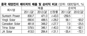 중국 태양전지 생산기업들이 고전을 면치 못하고 있다. 표, 그래프: < 중국 태양전지 메이저의 매출 및 순이익 비교 > <화학저널 2012/09/26> |