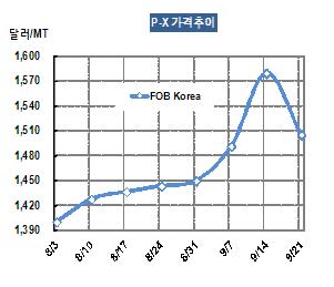 P-X 가격은 9월21일 FOB Korea 톤당 1506달러로 74달러 폭락했다. P-X 가격이 큰 영향을 미치는 나프타(Naphtha) 가격도 CFR Japan 톤당 935달러로 64달러 폭락했다. 표, 그래프: < P-X 가격추이 > <화학저널 2012/09/27> |