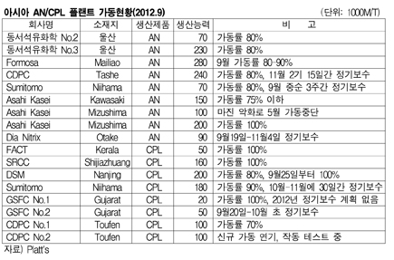 표, 그래프: < 아시아 AN/CPL 플랜트 가동현황(2012.9) >