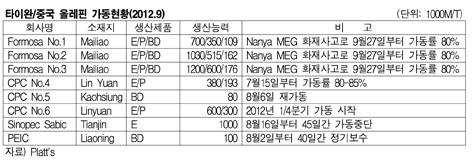 타이완 올레핀(Olefin) 시장의 공급과잉이 주춤할 조짐을 보이고 있다. 반면, 중국 올레핀 시장은 Sinopec Sabic 및 PEIC가 8-9월 정기보수에 들어가면서 수급타이트가 심화되고 있다. 표, 그래프: < 타이완/중국 올레핀 가동현황(2012.9) > <화학저널 2012/10/04> |
