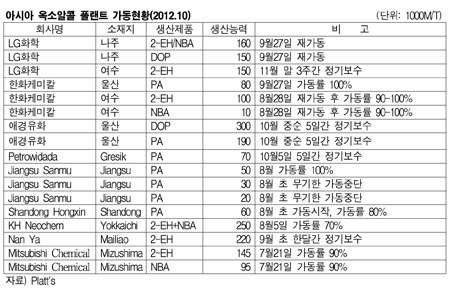 아시아 옥소알콜(Oxo-Alcohol) 시장은 9월 말 재가동으로 수급타이트가 완화될 것으로 예상된다. 한편, 애경유화는 울산 소재 PA 19만톤 및 DOP 30만톤 플랜트를 10월 중순부터 3-5일 동안 정기보수할 예정이며, Petrowidada도 Gresik 소재 PA 7만톤 플랜트를 10월5일부터 5일 동안 정기보수할 예정이나 수급에는 차질이 없을 것으로 보고 있다. <허웅 기자> 표, 그래프: < 아시아 옥소알콜 플랜트 가동현황(2012.10) > <화학저널 2012/10/09> |