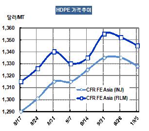 HDPE 가격은 10월3일 CFR FE Asia 톤당 1328달러로 7달러 하락했다. 생산기업 관계자는 “중국의 국경절 때문에 거래가 진행되지 않아 중국시장이 재개하기만 기다리고 있다”고 밝혔으며, 시장 관계자도 “거래량이 많은 중국 시장이 잠잠해 아무도 거래를 진행하려고 하지 않았다”고 말했다. 표, 그래프: < HDPE 가격추이 > <화학저널 2012/10/09> |