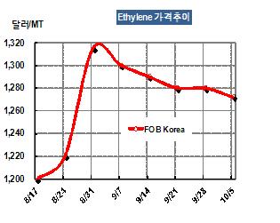 에틸렌 가격은 10월5일 FOB Korea 톤당 1272달러로 8달러 하락했다. 나프타 가격도 국제유가 약세의 영향을 받아 CFR Japan 톤당 953달러로 10달러 하락했다. 표, 그래프: < Ethylene 가격추이 > <화학저널 2012/10/09> |