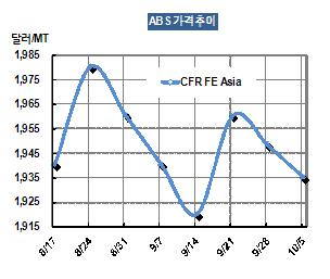 ABS 가격은 10월3일 CFR FE Asia 톤당 1935달러로 13달러 하락했다. 이에 따라 한국산은 CFR 톤당 1960달러, 타이완산은 CFR 1940달러에도 거래된 것으로 알려졌다. 표, 그래프: < ABS 가격추이 > <화학저널 2012/10/10> |