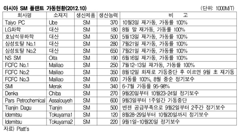아시아 SM(Styrene Monomer) 시장의 수급타이트가 다소 누그러들 것으로 예상된다. 반면, Denka는 Chiba 소재 SM 27만톤 플랜트를 9월20일부터 10월23-24일까지 정기보수할 예정이며, Idemitsu도 Tokuyama 소재 SM 22만톤 플랜트 및 12만톤 플랜트의 정기보수에 들어가 10월20일 마무리할 방침이다. <김다미 기자> 표, 그래프: < 아시아 SM 플랜트 가동현황(2012.10) > <화학저널 2012/10/11> |