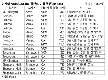 아시아 VCM(Vinyl Chloride Monomer) 시장은 수급타이트가 완화될 것으로 예상된다. 반면, CA(Chlor-Alkali) 시장은 50-60%대의 저조한 가동률을 나타내고 있다. 표, 그래프: < 아시아 VCM/CA/EDC 플랜트 가동현황(2012.10) > <화학저널 2012/10/11> |