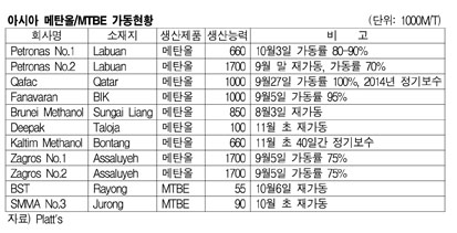 아시아 메탄올(Methanol) 시장은 10월 재가동 플랜트가 늘어나고, 가동률도 상승세를 지속해 공급이 완화될 것으로 예상된다. 반면, Deepak은 원료 부족으로 가동을 중단했던 Taloja 소재 메탄올 10만톤 플랜트를 11월 초 재가동할 예정이고, Kaltim Methanol은 Bontang 소재 66만톤 플랜트를 11월 초 40일 동안 정기보수할 방침이다. 표, 그래프: < 아시아 메탄올/MTBE 가동현황 > <화학저널 2012/10/12> |