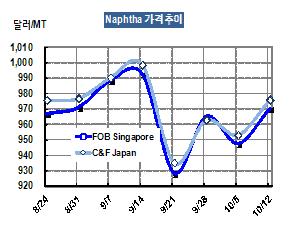 나프타 가격은 10월12일 CFR Japan 톤당 976달러로 23달러 상승했다.