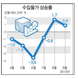 2012년 9월 수입물가가 8월에 이어 2개월째 오른 것으로 나타났다. 표, 그래프: < 수입물가 상승률 > <화학저널 2012/10/15> |