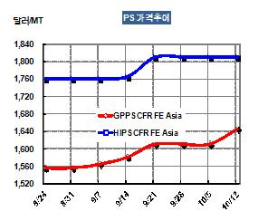 GPPS 가격은 10월10일 CFR FE Asia 톤당 1645달러로 35달러 급등했다. 그러나 중국시장이 8일간의 장기연휴가 끝났음에도 불구하고 수요가 약세를 지속하고 있어 추가 상승은 어려울 것으로 예상된다. 표, 그래프: < PS 가격추이 > <화학저널 2012/10/17> |