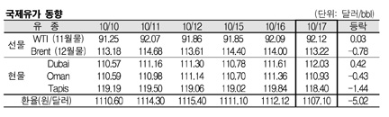 10월17일 국제유가는 미국의 원유 재고 증가 등으로 하락했다. 10월17일 국제유가는 미국산 원유 재고가 증가한 것으로 나타나면서 하락했다. 표, 그래프: < 국제유가 동향 > <화학저널 2012/10/18> |