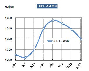 LDPE 가격은 10월17일 CFR FE Asia 톤당 1320달러로 18달러 하락했다.