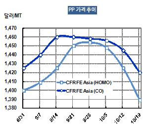 PP 가격은 10월17일 CFR FE Asia 톤당 1389달러로 36달러 급락했다. 프로필렌 가격은 10월19일 FOB Korea 톤당 1273달러로 14달러 하락했다. 표, 그래프: < PP 가격추이 > <화학저널 2012/10/23> |