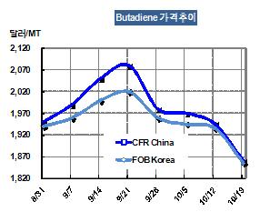부타디엔 가격은 10월19일 FOB Korea 톤당 1855달러로 81달러 폭락했다. 중국의 부타디엔 수요기업들은 11월 공급물량에 대해 CFR China 톤당 1800-1850달러에 구매하겠다는 의사를 나타낸 것으로 알려졌다. 표, 그래프: < Butadiene 가격추이 > <화학저널 2012/10/23> |