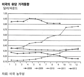 세계 유당 수급이 2013년 이후 타이트해질 가능성이 높은 것으로 나타나고 있다. 표, 그래프: < 미국의 유당 가격동향 > <화학저널 2012/10/23> |