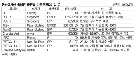 표, 그래프: < 동남아시아 올레핀 플랜트 가동현황(2012.10) > <화학저널 2012/10/24> |