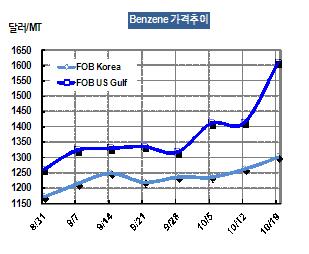 벤젠 가격은 10월19일 FOB Korea 톤당 1301달러로 38달러 상승했다. 그러나 미국의 부타디엔 현물가격이 FOB US Gulf 갤런당 536센트로 톤당 1607달러 중반을 형성함으로써 무려 195달러 폭등해 아시아 가격 상승으로 이어졌다. 표, 그래프: < Benzene 가격추이 > <화학저널 2012/10/24> |