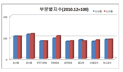 한국수입업협회에 따르면, 9월 KOIMA지수는 전월대비 2.8%포인트 상승한 366.21포인트를 기록했다. 표, 그래프: < 부문별지수(2010.12=100) > <화학저널 2012/10/25> |