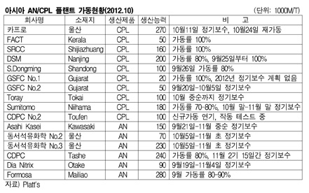 표, 그래프: < 아시아 AN/CPL 플랜트 가동현황(2012.10) > <화학저널 2012/10/25> |