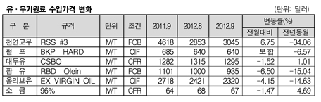 표, 그래프: < 유․무기원료 수입가격 변화 > <화학저널 2012/10/26> |
