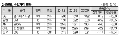 표, 그래프: < 섬유원료 수입가격 변화 > <화학저널 2012/10/26> |