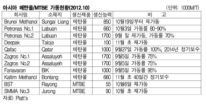 표, 그래프: < 아시아 메탄올/MTBE 가동현황(2012.10) >
