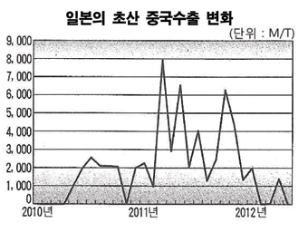 중국에 대한 초산(Acetic Acid0 수출에 제동이 걸렸다. 표, 그래프: < 일본의 초산 중국수출 변화 > <화학저널 2012/10/29> |