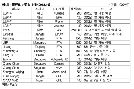 아시아의 신규 석유화학 플랜트 건설이 경기불황에도 불구하고 잇따르는 가운데 LG화학이 2012년 대규모 증설 완료를 앞두고 있어 주목된다.