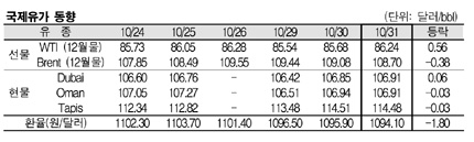 10월31일 국제유가는 유럽의 경기지표 악화, 영국 북해 유전 공급량 증가 전망 등으로 하락했다. 10월31일 국제유가는 유럽의 경기지표 악화 소식 및 그리스 경기침체 우려로 하락했다. 표, 그래프: < 국제유가 동향 > <화학저널 2012/11/01> |