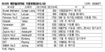 아시아 메탄올(Methanol) 시장은 재가동 계획이 이어지면서 공급과잉으로 전환될 것으로 예상된다. 반면, Zagros는 Assaluyeh 소재 메탄올 No.1 170만톤 및 No.2 170만톤 플랜트의 가동률을 75% 수준으로 낮게 운영하고 있으며, Kaltim Methanol은 Bontang 소재 66만톤 플랜트를 11월 초 40일 동안 정기보수할 방침으로 알려졌다. 표, 그래프: < 아시아 메탄올/MTBE 가동현황(2012.10) > <화학저널 2012/11/02> |