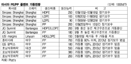 표, 그래프: < 아시아 PE/PP 플랜트 가동현황 > <화학저널 2012/11/06> |